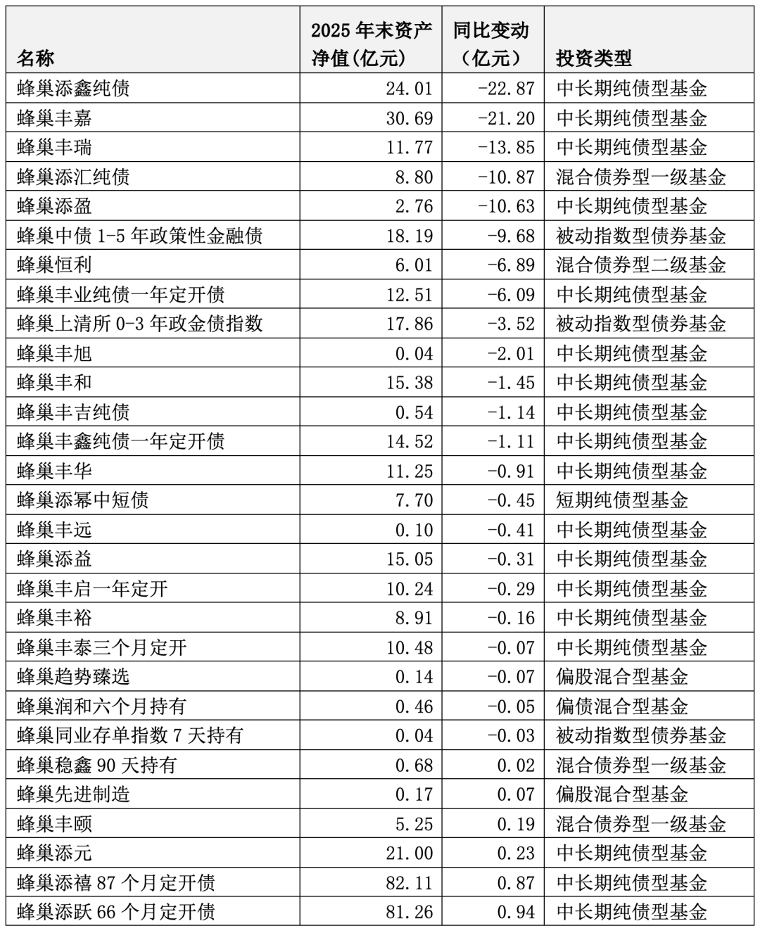 蜂巢基金旗下有29只公募产品,2025年规模下降的多达23只。其中,2只基金规模缩水超过20亿元,分别为蜂巢添鑫纯债(-22.87亿元)、蜂巢丰嘉(-21.20亿元);3只基金规模缩水超过10亿元,分别为蜂巢丰瑞(-13.85亿元)、蜂巢添汇纯债(-10.87亿元)、蜂巢添盈(-10.63亿元)。