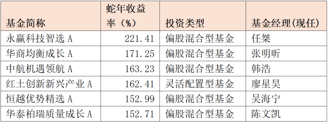 Wind数据显示,有170只基金的表现尤为突出,蛇年收益率高达100%以上。其中,有6只基金的收益率超150%,分别为永赢科技智选A(022364)、华商均衡成长A(011369)、中航机遇领航A(018956)、红土创新新兴产业A(001753)、恒越优势精选A(011815)、华泰柏瑞质量成长A(008528),全部为主动权益类基金。