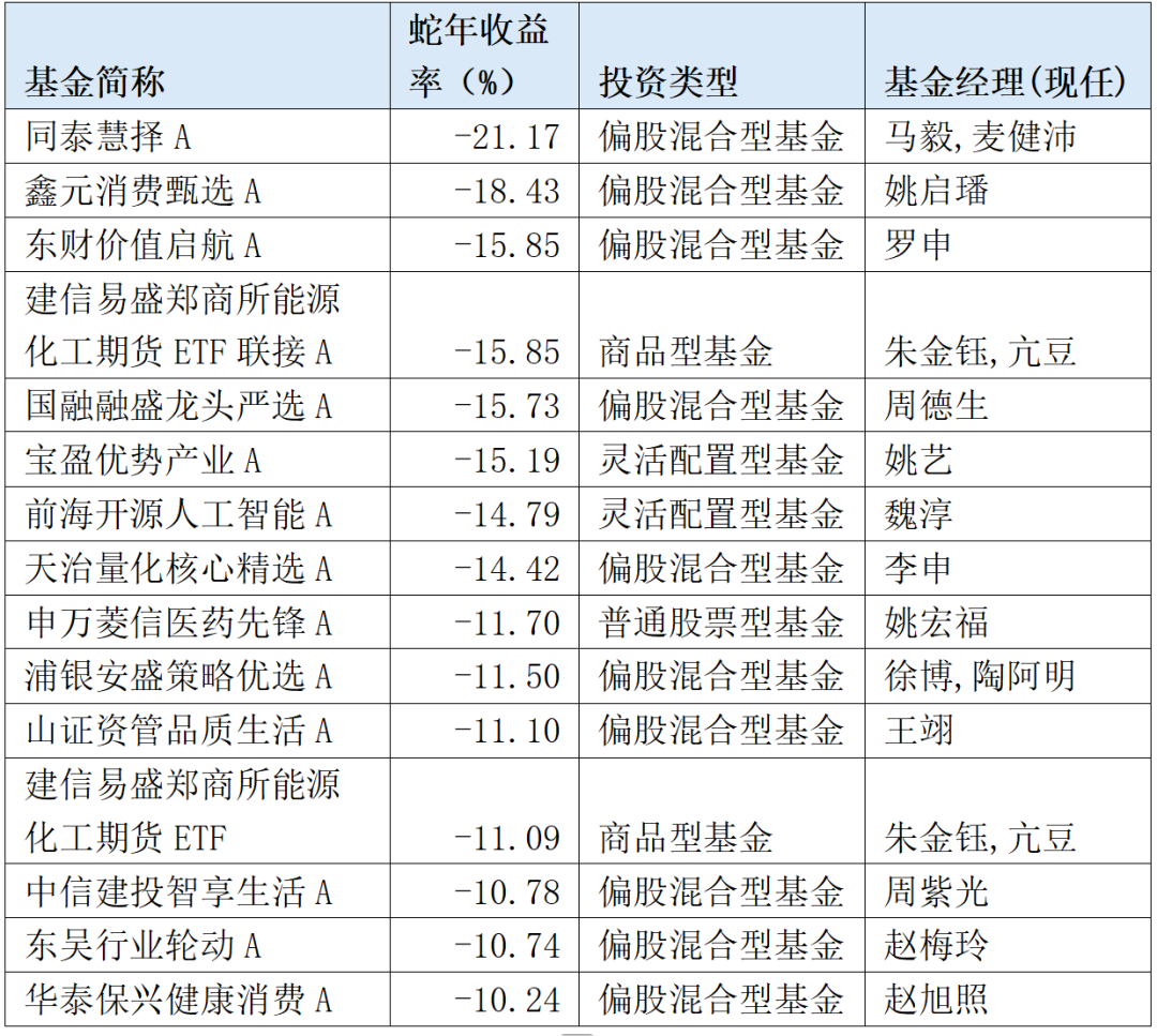 值得一提的是,在行业整体表现亮眼的背景下,仍有部分产品业绩承压——311只基金蛇年录得负收益。