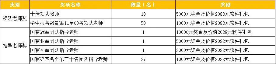 优秀指导老师:国赛冠军团队指导老师获10000元奖金;国赛亚军团队指导老师获5000元奖金;国赛季军团队指导老师获3000元奖金;国赛第四名至第三十名团队指导老师获1000元奖金。