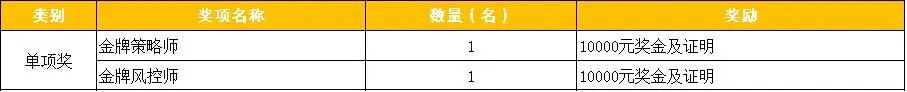 单项奖项:省赛及国赛阶段,策略师和风控师按照要求分别定期提交策略报告和风控报告。大赛评选金牌策略师和金牌风控师各一名,分别获得10000元奖金及证明。