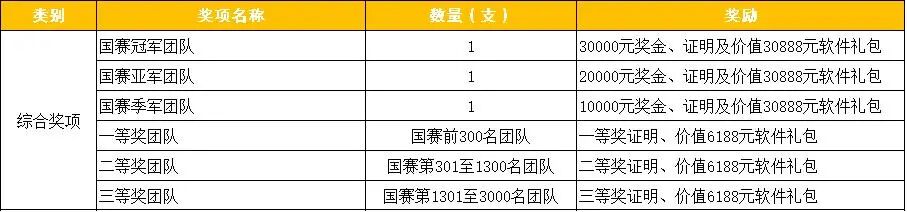 国赛冠军团队获30000元奖金及证明;国赛亚军团队获20000元奖金及证明;国赛季军团队获10000元奖金及证明,国赛冠亚季军团队成员均可获得价值30888元的软件大礼包一份。