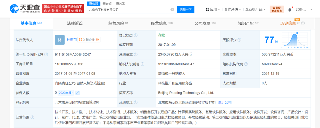 北京庖丁科技有限公司成立于2017年1月,法定代表人为林得苗,注册资本约2345.68万人民币,经营范围含销售自行开发后的产品、计算机系统服务、基础软件服务、应用软件服务、软件开发等,现由林得苗、罗平、北京众庖同心科技中心(有限合伙)等共同持股。