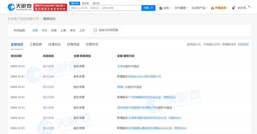 天眼查App显示,近日,北京庖丁科技有限公司发生工商变更,深圳深度冲击智能科技有限公司、王卓、郭瑞仁退出股东行列,新增珠海金山办公软件有限公司、顺为资本旗下天津海河顺科股权投资合伙企业(有限合伙)、深圳顺赢私募股权投资基金合伙企业(有限合伙)、广州初枫股权投资合伙企业(有限合伙)为股东,同时,部分主要人员也发生变更。