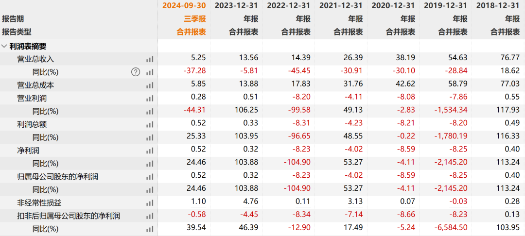 2024年前三季度,公司营收和净利润分别为5.25亿元和0.52亿元,增速分别为-37.28%和24.46%。前三季度,美邦服饰的资产处置收益实现6778万。扣非后净利润为-5811万元,仍然处于亏损状态。