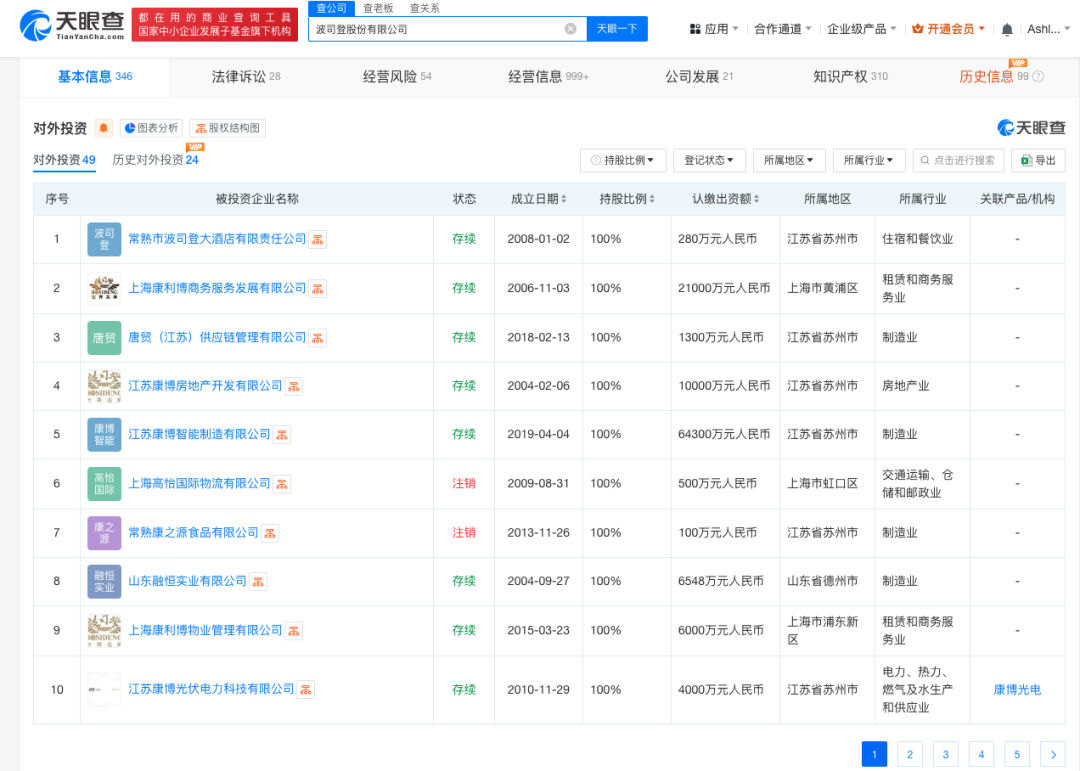 天眼查信息显示,波司登直接持股49家企业,其中34家为存续状态