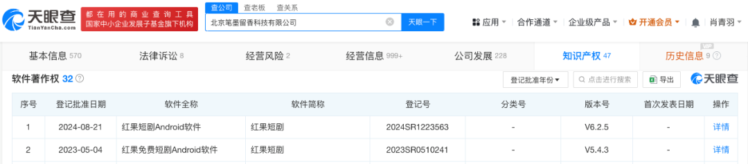 天眼查App显示,红果短剧关联公司北京笔墨留香科技有限公司成立于2021年7月,法定代表人为莫少君,注册资本100万人民币,经营范围含电影摄制、组织文化艺术交流活动、影视策划、出版物零售等,由北京抖音信息服务有限公司全资持股。