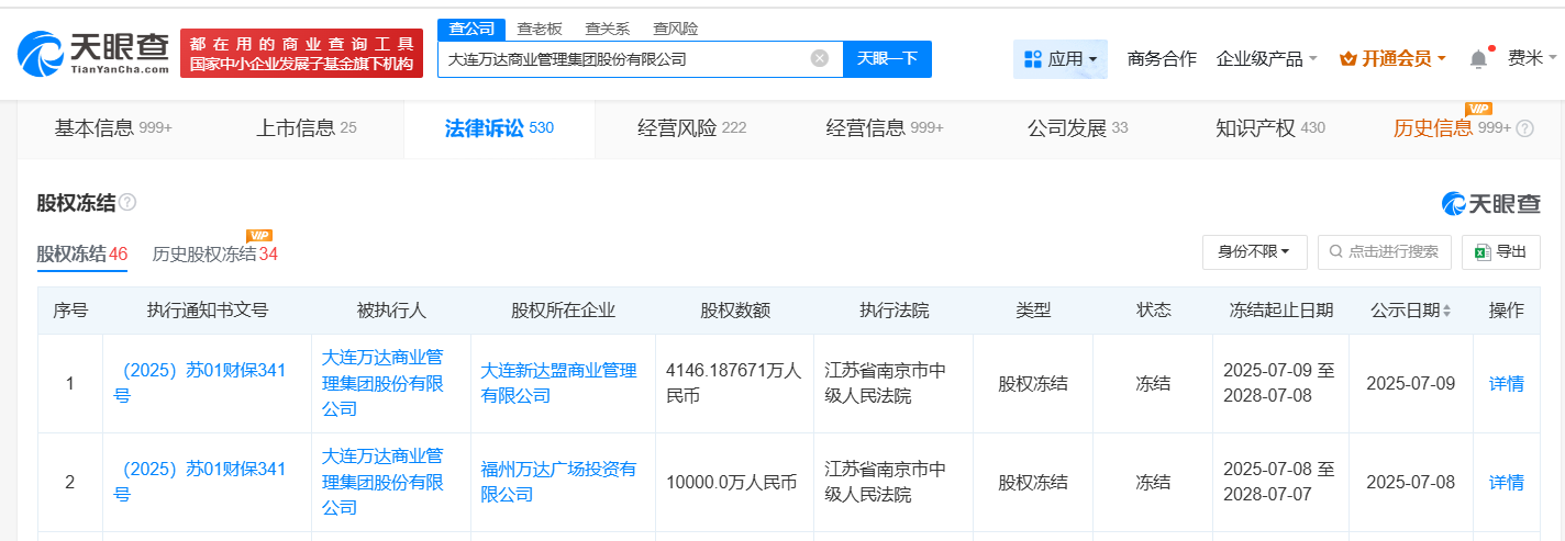天眼查法律诉讼信息显示,近日,大连万达商业管理集团股份有限公司新增两则股权冻结信息,被执行人为该公司,股权所在企业分别为大连新达盟商业管理有限公司、福州万达广场投资有限公司,冻结股权数额合计超1.4亿,冻结期限均为三年,执行法院均为江苏省南京市中级人民法院。
