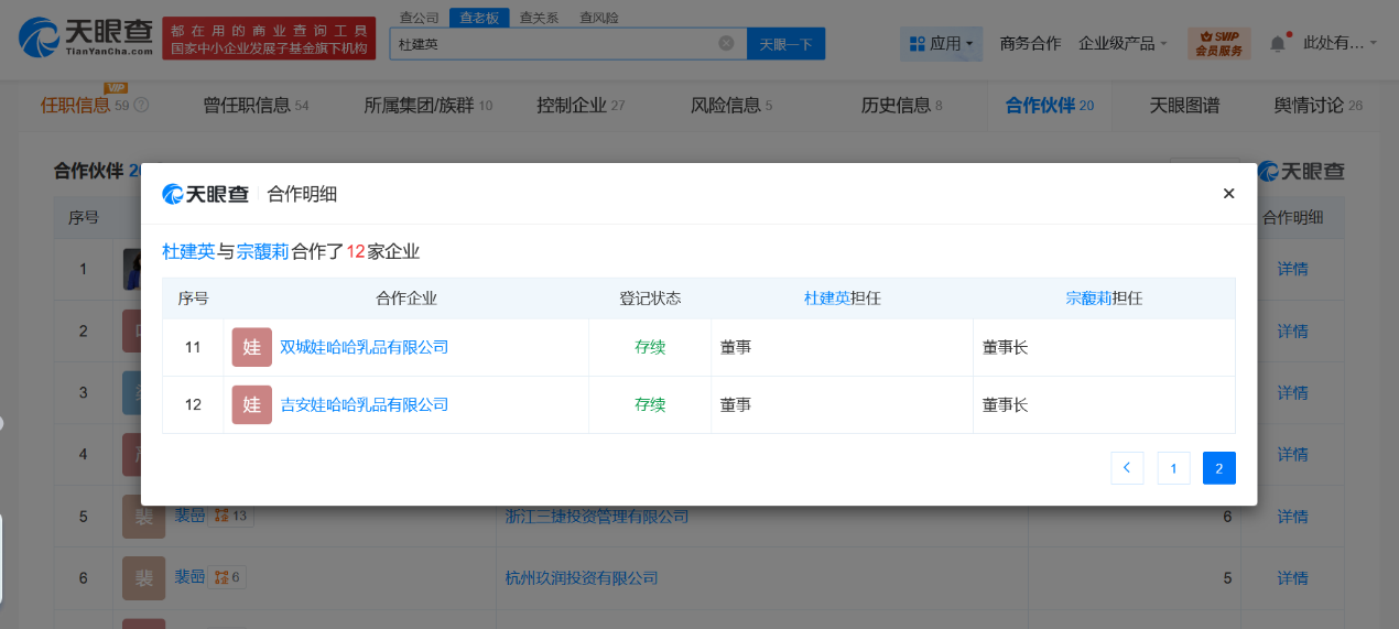 商业履历信息显示,杜建英名下关联50余家企业,包括深圳娃哈哈荣泰实业有限公司、南京娃哈哈饮料有限公司等。此外,杜建英与宗馥莉二人共同关联12家公司,与宗馥莉和宗继昌(JACKY ZONG)三人共同关联7家公司,包括陕西娃哈哈乳品有限公司、吉安娃哈哈乳品有限公司、南京娃哈哈饮料有限公司等,宗馥莉在三人关联公司中均担任董事长,杜建英、宗继昌均担任董事。