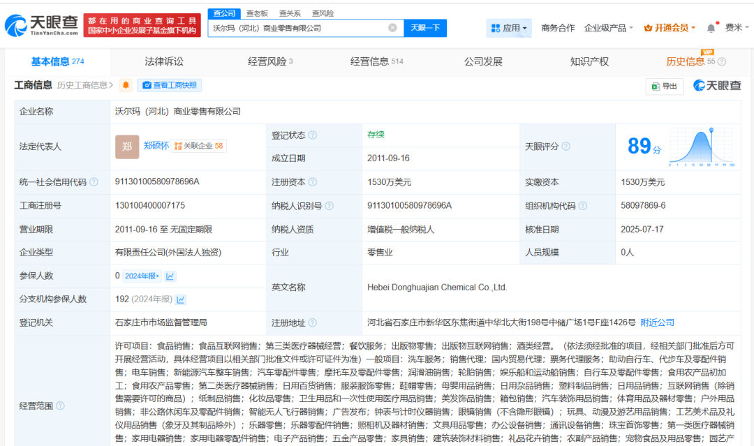 沃尔玛(河北)商业零售有限公司、沃尔玛(沈阳)商业零售有限公司分别成立于2011年9月、2018年7月,注册资本分别为1530万美元、约469万美元,经营范围均包括食品销售、第三类医疗器械经营、酒类经营等。股东信息显示,上述两家公司均由沃尔玛(中国)投资有限公司全资持股。