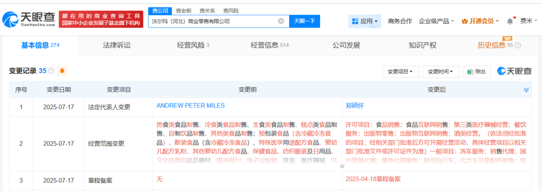 天眼查App显示,近日,沃尔玛(河北)商业零售有限公司发生工商变更,ANDREW PETER MILES卸任法定代表人、执行董事,郑硕怀接任法定代表人并担任董事。此前,沃尔玛(沈阳)商业零售有限公司也发生工商变更,方晓峰卸任法定代表人、执行董事,郑硕怀接任法定代表人并担任董事。