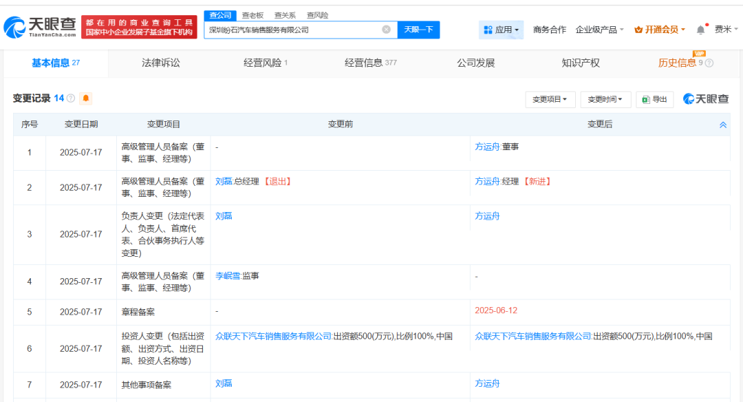 天眼查App显示,近日,深圳纷石汽车销售服务有限公司发生工商变更,刘磊卸任法定代表人、执行董事、总经理,方运舟接任法定代表人并担任董事、经理。此前,广州合达天下汽车销售服务有限公司发生工商变更,刘磊卸任法定代表人、董事、经理,由方运舟接任。