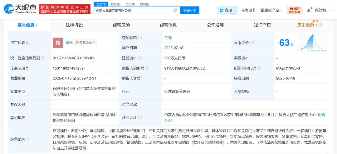 天眼查App显示,近日,内蒙古乳趣文旅有限公司成立,法定代表人为储伟,注册资本300万人民币,经营范围含旅游业务、食品销售、游览景区管理、教育咨询服务、会议及展览服务、露营地服务、日用百货销售、票务代理服务等。股东信息显示,该公司由内蒙古蒙牛乳业(集团)股份有限公司全资持股。