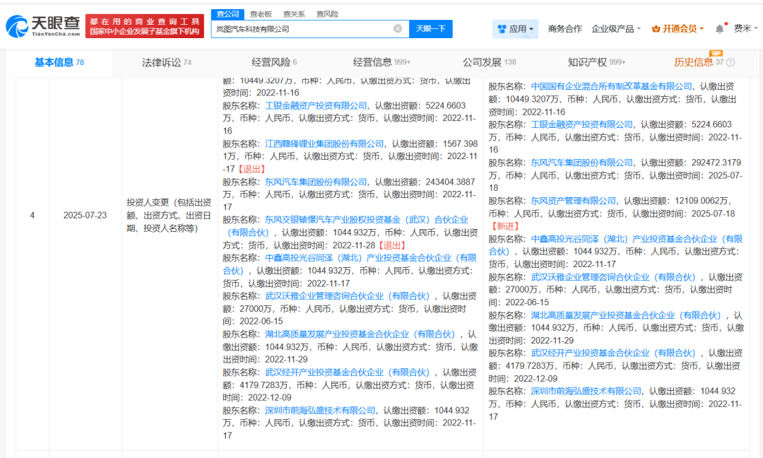 天眼查App显示,近日,岚图汽车科技有限公司发生工商变更,原股东赣锋锂业(002460)、东风交银辕憬汽车产业股权投资基金(武汉)合伙企业(有限合伙)退出,新增东风资产管理有限公司为股东,注册资本由约30.9亿人民币增至约36.7亿人民币,增幅约19%,同时多位高管发生变更。