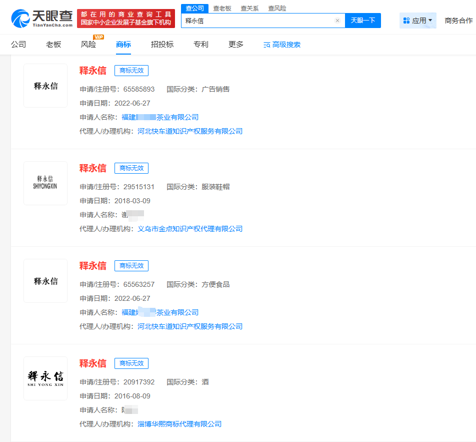 此外,天眼查知识产权信息显示,“释永信”曾被多方申请注册为商标,国际分类涉及广告销售、服装鞋帽、方便食品等,当前商标状态均为无效状态。