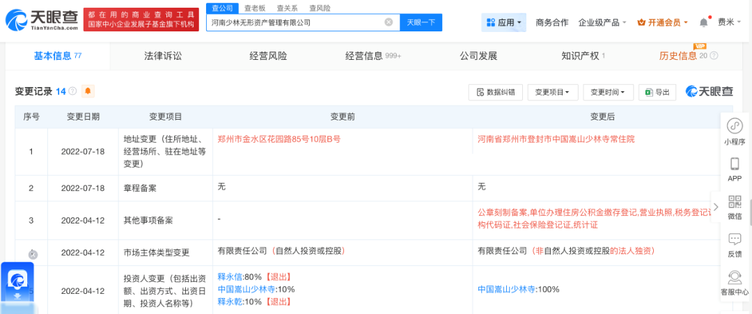 值得一提的是,2022年4月,释永信退出河南少林无形资产管理有限公司,退出前持股比例为80%。对外投资信息显示,该公司持有14家公司股份,仅少林欢喜地(登封)有限公司1家为存续状态,版图涉及投资、演艺、茶业等。近日,少林欢喜地(登封)有限公司因未按规定公示年报,被列入经营异常名录,此前该公司已发布注销备案信息。