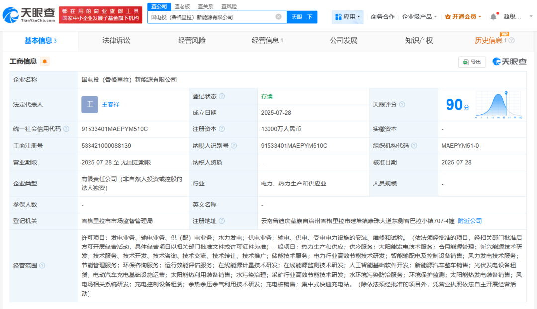 国电投(香格里拉)新能源有限公司成立,法定代表人为王春祥,注册资本1.3亿人民币,经营范围包括储能技术服务、电力行业高效节能技术研发、人工智能基础软件开发、新能源汽车整车销售等。股权全景穿透图显示,该公司由国家电力投资集团旗下北京中和零碳能源有限公司全资持股。