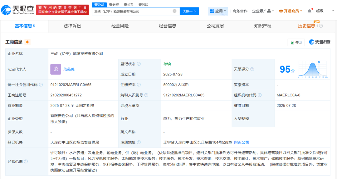 三峡(辽宁)能源投资有限公司成立,法定代表人为范薇薇,注册资本5亿人民币,经营范围包括储能技术服务、新兴能源技术研发、生态恢复及生态保护服务等。股东信息显示,该公司由三峡能源(600905)全资持股。