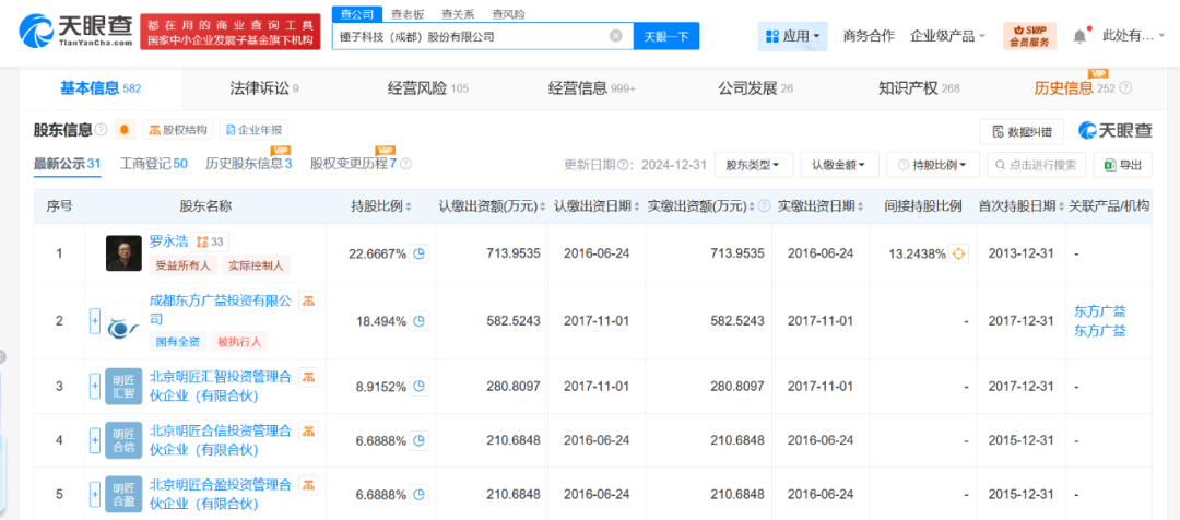 锤子科技(成都)股份有限公司成立于2012年5月,法定代表人为管志良,注册资本约3149.8万人民币,经营范围含基础软件服务、应用软件服务、组织文化艺术交流活动、承办展览展示活动等。主要人员信息显示,罗永浩在该公司担任董事长并持股约23%。