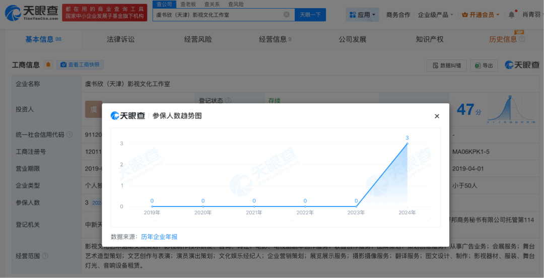 天眼查任职企业信息显示,虞书欣名下关联3家公司,仅虞书欣(天津)影视文化工作室为存续状态,该工作室成立于2019年4月,出资额10万人民币,为虞书欣个人独资企业,经营范围含影视文化艺术活动交流策划、电影、电视剧剧本创作服务、歌曲创作服务等。年报信息显示,该公司2019年至2023年参保人数均为0,2024年华策影视与虞书欣合约到期当年,参保人数增至3人。