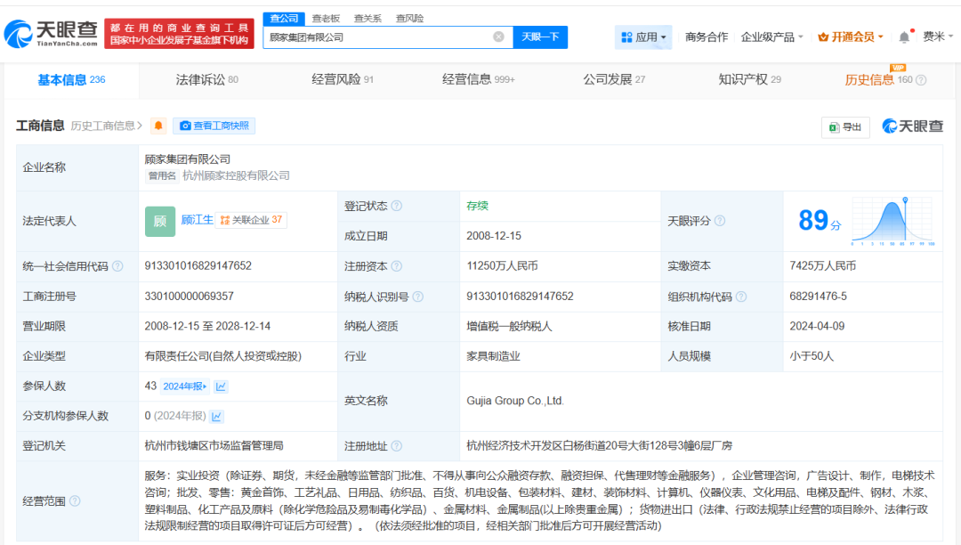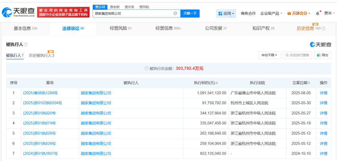 天眼查天眼风险信息显示,8月5日,顾家集团有限公司、顾江生等新增一则被执行人信息,执行标的10.9亿余元,执行法院为广东省佛山市中级人民法院。