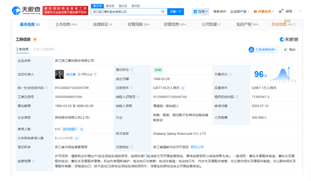 浙江钱江摩托股份有限公司成立于1999年3月,法定代表人为徐志豪,注册资本约5.3亿人民币