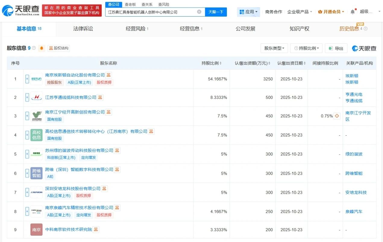 股东信息显示,该公司由埃斯顿(002747)、江苏亨通线缆科技有限公司、绿的谐波(688017)、安培龙(301413)、泉峰汽车(603982)等共同持股。
