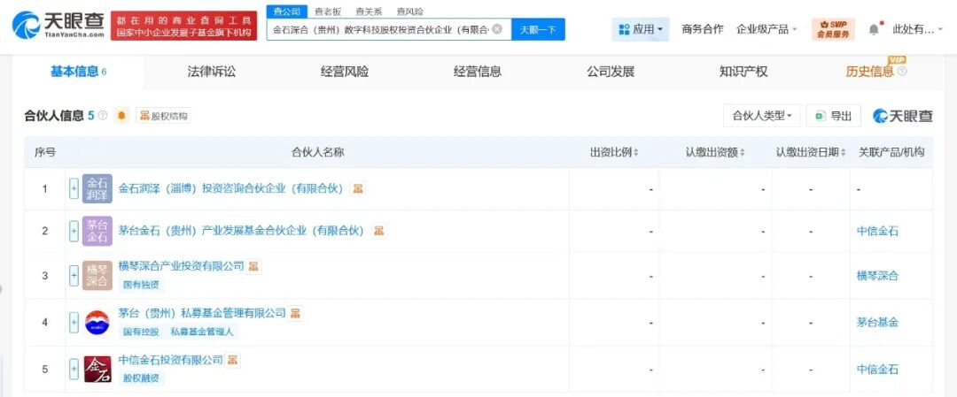 合伙人信息显示,该合伙企业由茅台旗下茅台金石(贵州)产业发展基金合伙企业(有限合伙)、茅台(贵州)私募基金管理有限公司以及金石润泽(淄博)投资咨询合伙企业(有限合伙)、横琴深合产业投资有限公司、中信金石投资有限公司共同出资。