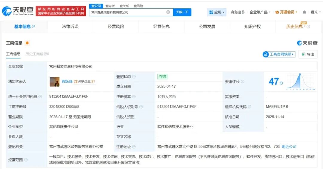 该公司成立于今年4月,法定代表人为蒋烁淼,注册资本10万人民币,经营范围包括信息咨询服务、软件开发、货物进出口等。