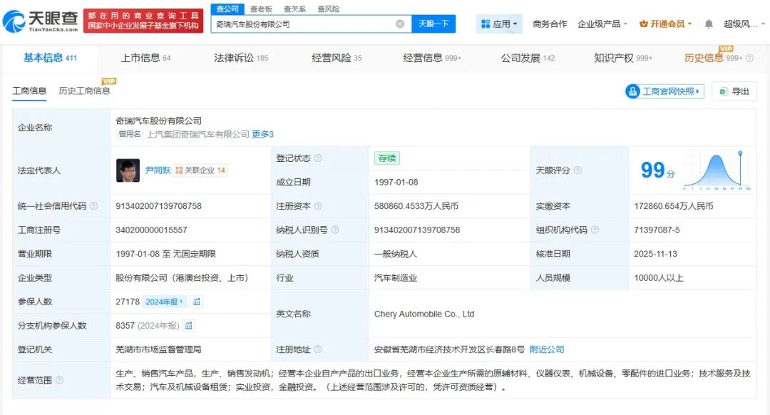 天眼查App显示,近日,奇瑞汽车股份有限公司发生工商变更,注册资本由约54.7亿人民币增至约58.1亿人民币,增幅约6%。