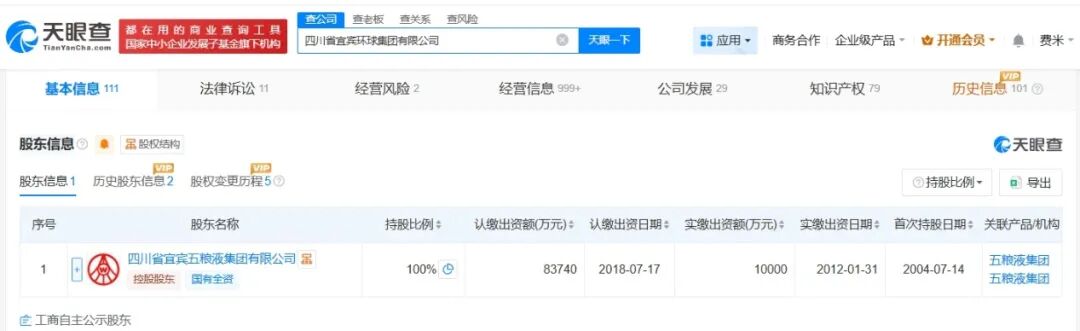 四川省宜宾环球集团有限公司成立于2004年7月,法定代表人为刘兴,经营范围包含企业管理、货物进出口、玻璃制造、普通玻璃容器制造等。股东信息显示,该公司由四川省宜宾五粮液集团有限公司全资持股。