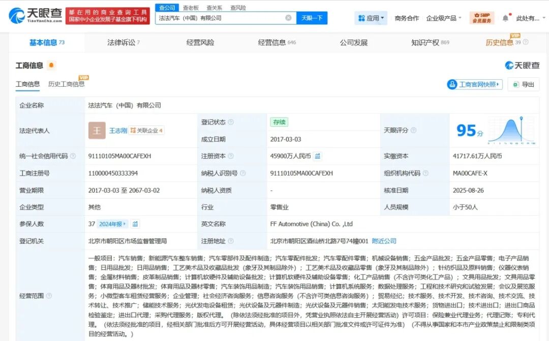 天眼查工商信息显示,近日,法法汽车(中国)有限公司发生工商变更,注册资本由4.59亿人民币增至4.75亿人民币。