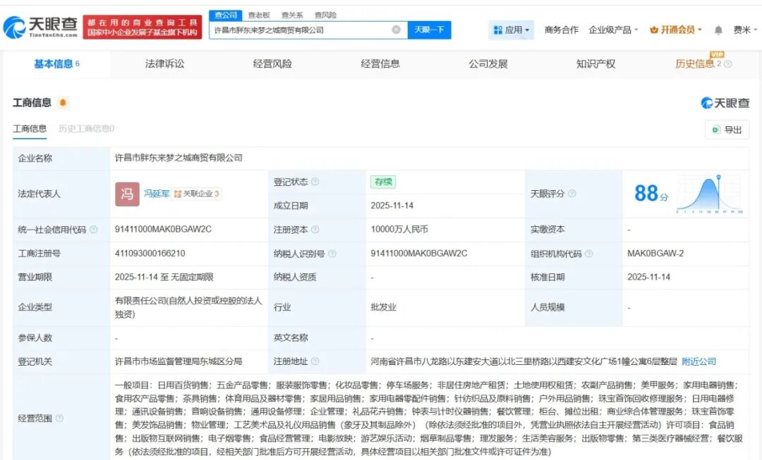 天眼查App显示,近日,许昌市胖东来梦之城商贸有限公司成立,法定代表人为冯延军,注册资本1亿人民币,经营范围包括日用百货销售、五金产品零售、服装服饰零售、化妆品零售等。股东信息显示,该公司由许昌市胖东来商贸集团有限公司全资持股。