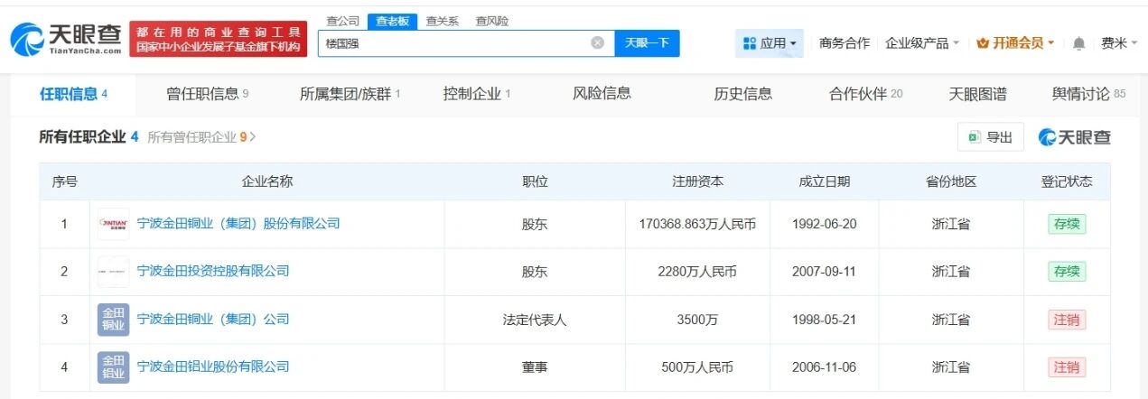 天眼查任职信息显示,楼国强名下关联4家企业,其中2家处于存续状态,分别是宁波金田铜业(集团)股份有限公司、宁波金田投资控股有限公司,楼国强持有两家公司股份,其余2家企业已注销。