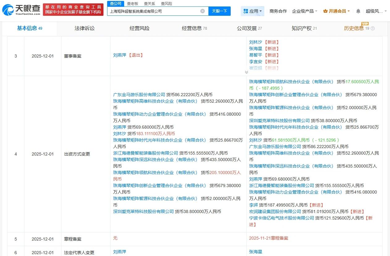 股东信息显示,该公司现由珠海横琴矩阵创新企业管理合伙企业(有限合伙)、珠海横琴矩阵深远科技合伙企业(有限合伙)及上述新增股东等共同持股。公开信息显示,矩阵超智为人形机器人研发公司。