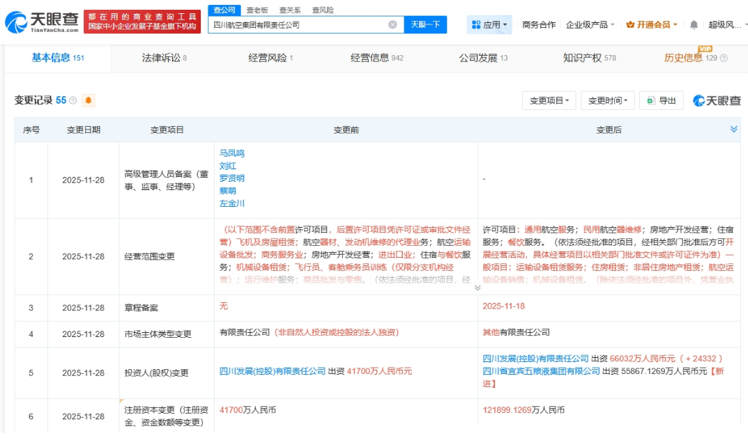 天眼查工商信息显示,近日,四川航空集团有限责任公司发生工商变更,新增四川省宜宾五粮液集团有限公司为股东,注册资本由4.17亿人民币增至约12.19亿人民币。
