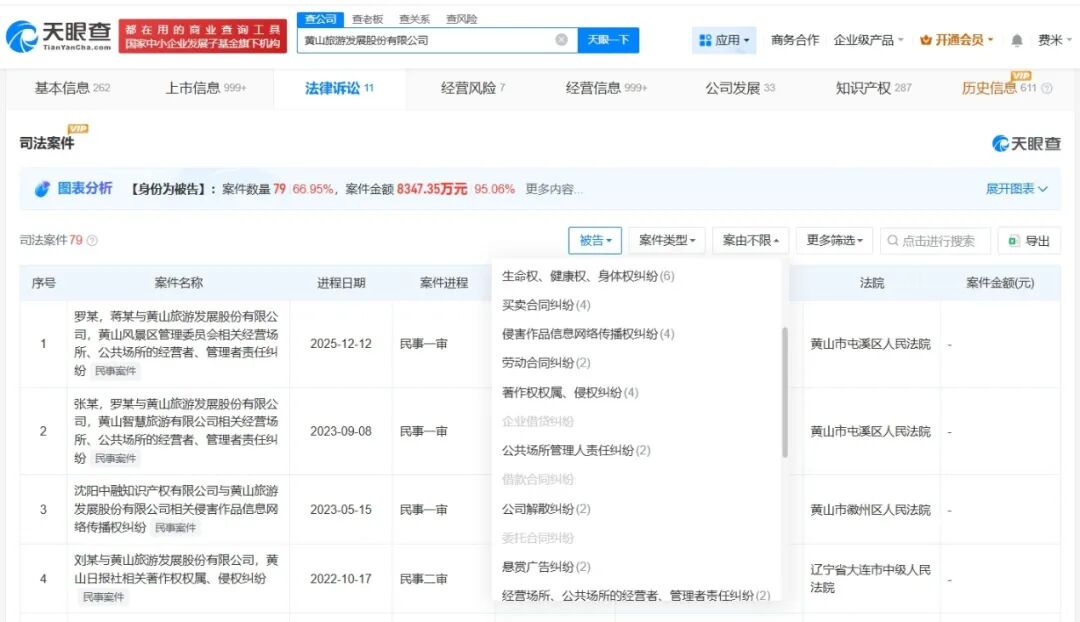 天眼查工商信息显示,涉事公司黄山旅游发展股份有限公司成立于1996年11月,法定代表人为章德辉,注册资本约7.3亿人民币,经营范围包括名胜风景区管理、游览景区管理、休闲观光活动等。