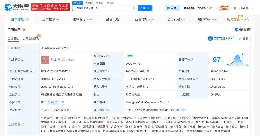 天眼查工商信息显示,携程集团有限公司于2021年2月成立于开曼群岛,公司类别为注册非香港公司。此外,携程集团在内地关联主体上海携程商务有限公司成立于2000年7月,法定代表人为孙波,注册资本9亿人民币,经营范围含互联网信息服务、会议及展览服务、信息咨询服务、酒店管理、餐饮管理等。