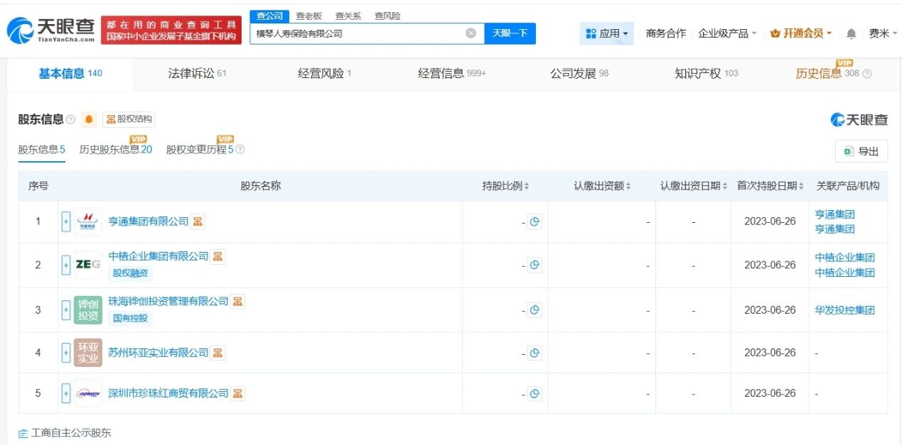 股东信息显示,该公司由亨通集团有限公司、中植企业集团有限公司、珠海铧创投资管理有限公司、苏州环亚实业有限公司、深圳市珍珠红商贸有限公司共同持股。