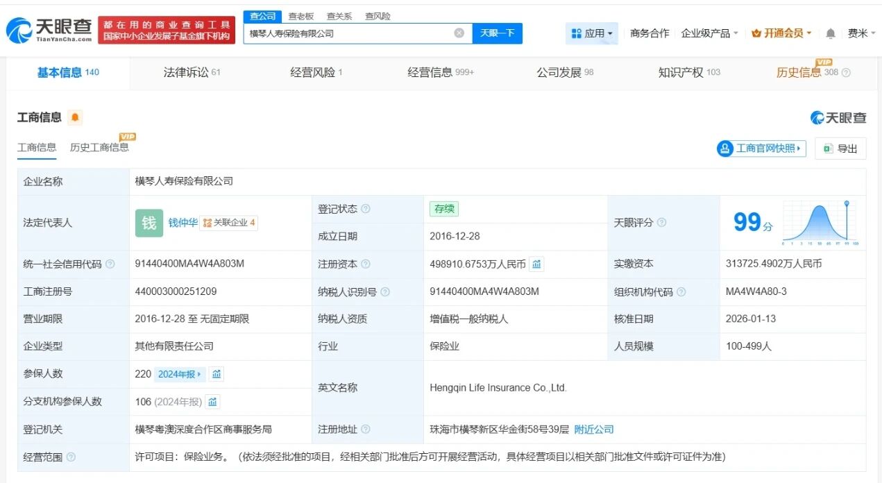 天眼查工商信息显示,近日,横琴人寿保险有限公司发生工商变更,注册资本由约31.4亿人民币增至约49.9亿人民币,增幅约59%。