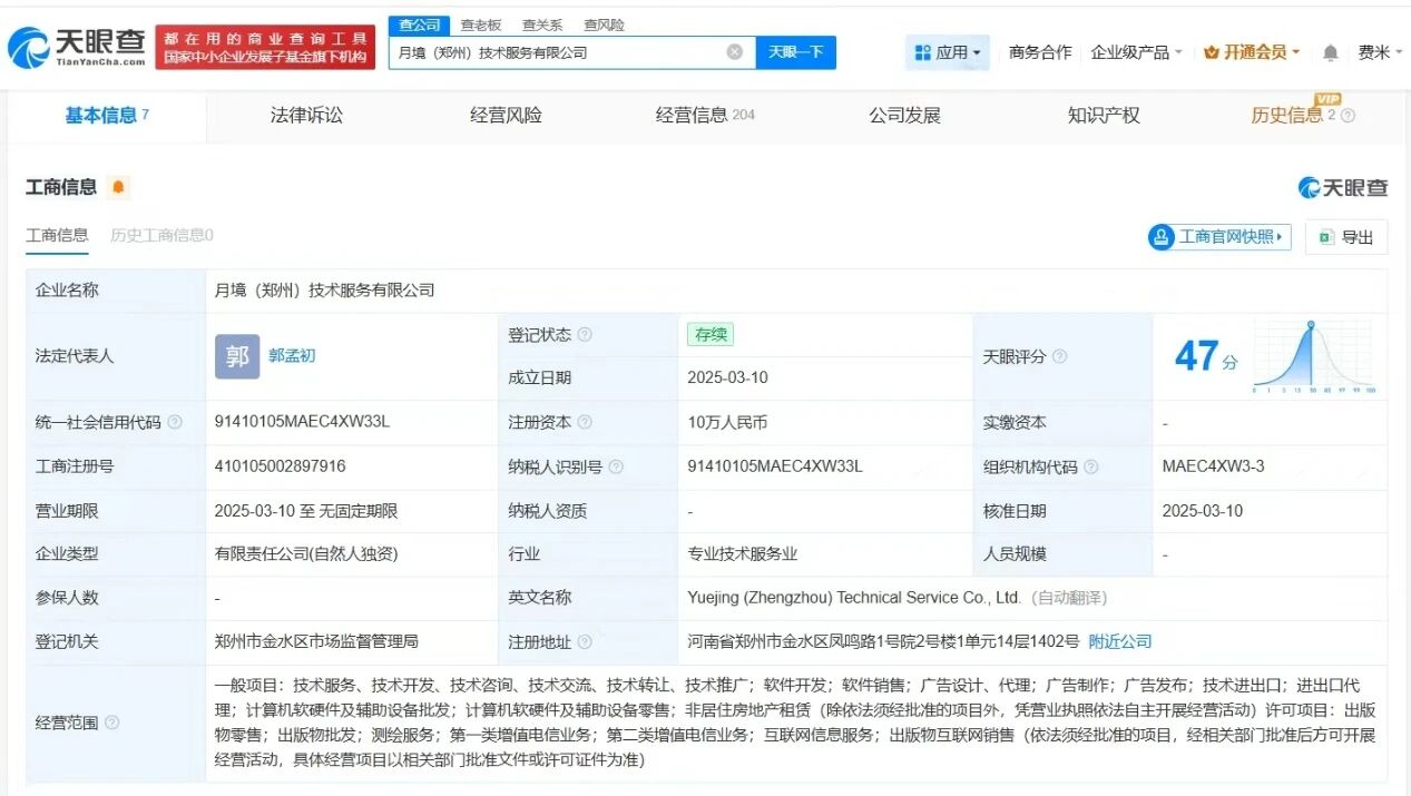 “死了么”App关联公司月境(郑州)技术服务有限公司成立于2025年3月,郭孟初全资持股该公司