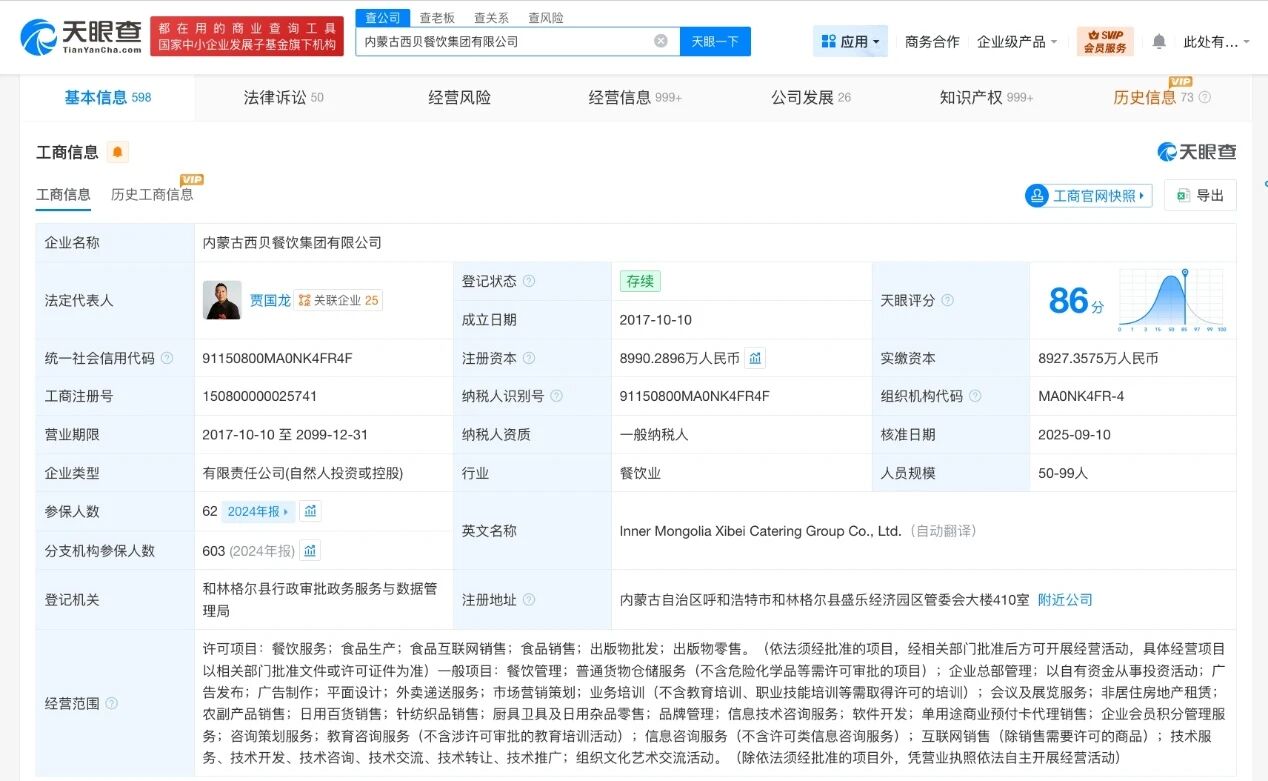 天眼查工商信息显示,西贝关联公司内蒙古西贝餐饮集团有限公司成立于2017年10月,法定代表人为贾国龙,注册资本约8990万元人民币,经营范围含餐饮服务、食品生产、食品互联网销售、食品销售、餐饮管理、普通货物仓储服务、以自有资金从事投资活动等。