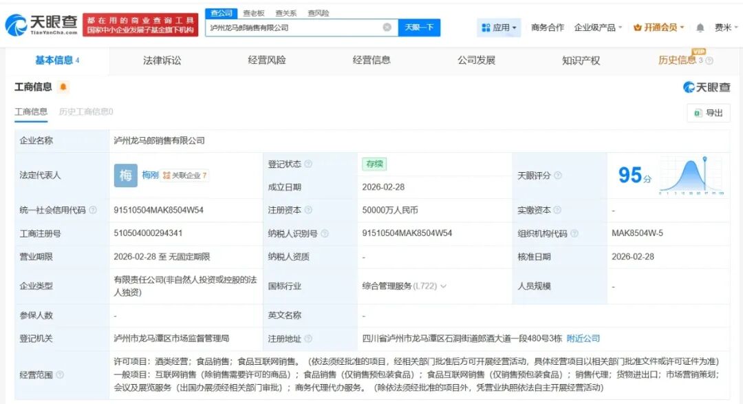 天眼查工商信息显示,近日,泸州龙马郎销售有限公司、古蔺红花郎销售有限公司、古蔺郎酒电子商务有限公司成立,法定代表人分别为梅刚、李俊、梅刚,注册资本分别为5亿人民币、5亿人民币、1亿人民币,经营范围包括酒类经营、食品销售、食品互联网销售等。