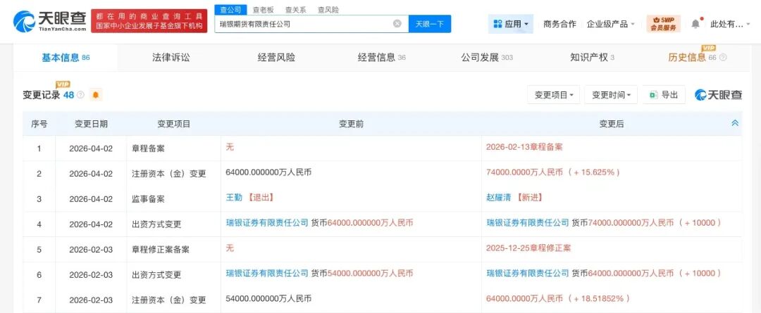 天眼查工商信息显示,近日,瑞银期货有限责任公司发生工商变更,注册资本由6.4亿人民币增至7.4亿人民币,增幅约16%。