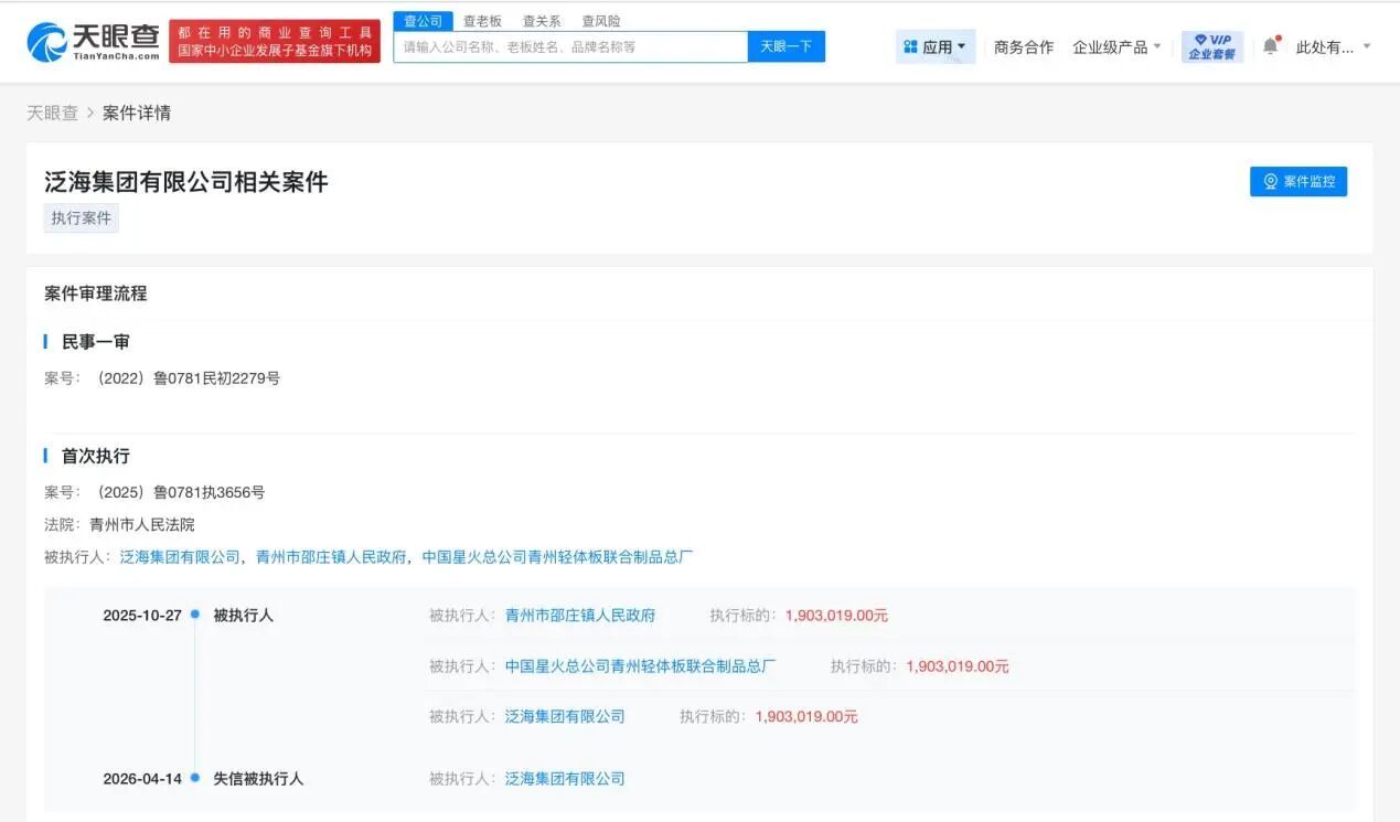 天眼查法律诉讼信息显示,近日,泛海集团有限公司因违反财产报告制度,被青州市人民法院列为失信被执行人(老赖),履行情况为全部未履行。案件流程信息显示,2025年10月,该公司被执行190.3万余元。