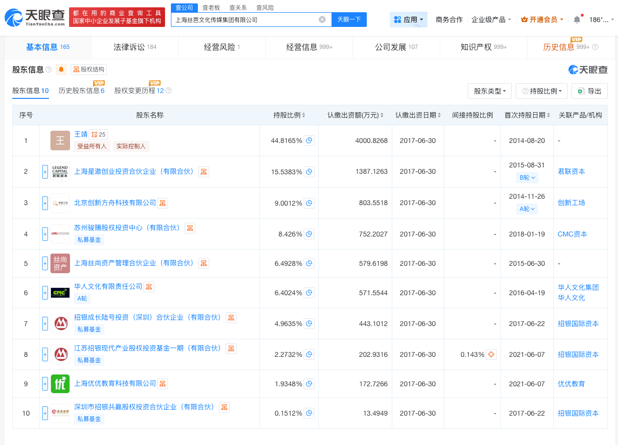 天眼查App显示,上海丝芭文化传媒集团有限公司成立于2010年5月,法定代表人为王靖,注册资本约8927万元人民币,经营范围包括营业性演出、演出经纪、广播电视节目制作经营等,由王靖、上海丝尚资产管理合伙企业(有限合伙)等共同持股。