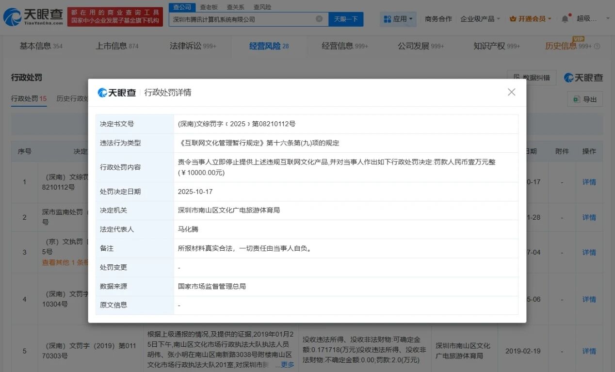 因提供含有危害社会公德内容的互联网文化产品,被深圳市南山区文化广电旅游体育局罚款1万元