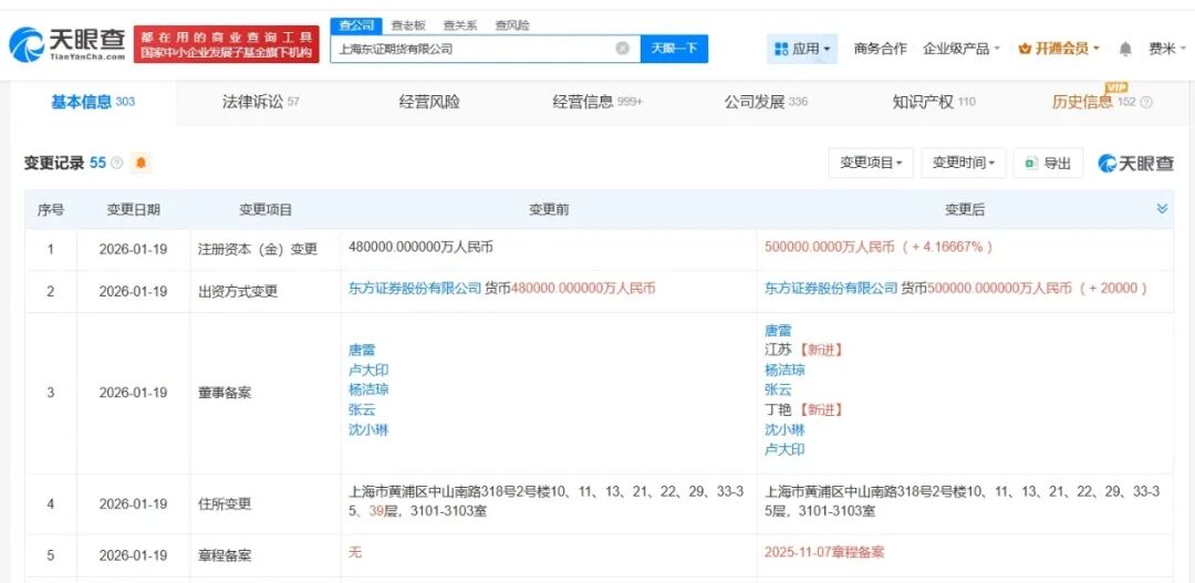 上海东证期货有限公司注册资本由48亿人民币增至50亿人民币,部分主要人员发生变更