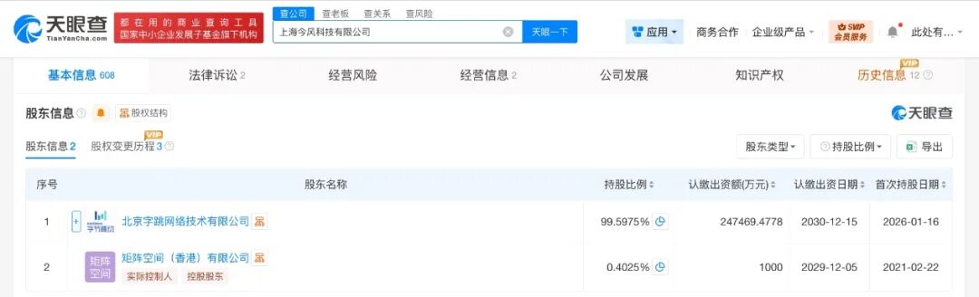 上海今风科技有限公司新增北京字跳网络技术有限公司为股东,注册资本增幅约24747%