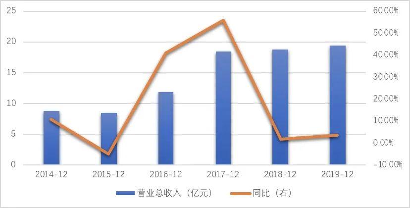 不过,该公司2014年—2019年营业收入总体上却始终处于增长态势,分别为8.85亿元、8.40亿元、11.84亿元、18.43亿元、18.77亿元和19.41亿元。且2019年营收较2014年增幅高达119.32%。